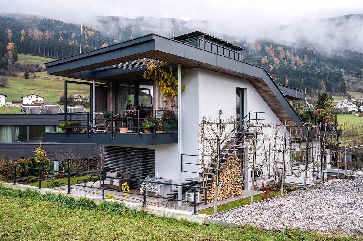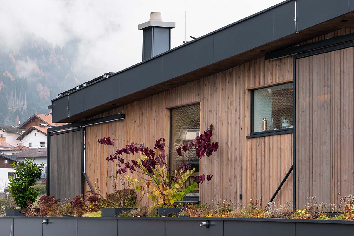 Viel grün und die Natur nach innen holen. Grob zusammengefasst waren das die Vorgaben im Planungprozess zu diesem Wohnhaus. Entstanden ist ein klarer, kompakter Baukörper, der auf seinen 3 Wohnebenen viele kleine Plätze zum verweilen und sich wohlfühlen schafft. Gezielt platzierte Fassadenöffnungen richten den Blick nach draußen: In den liebevoll gestalteten Garten, in die schöne Umgebung des kleinen Dorfes oder in die imposante Tiroler Bergwelt.